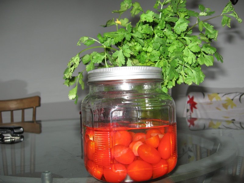 J and I tried to experiment with a recipe we found online last week. The recipe didn’t turn out very well and is not worth sharing, however , since we infused vodka with chilli and tomatoes, it made for a very pleasing visual. Here are two photos at different stages of the infusion.