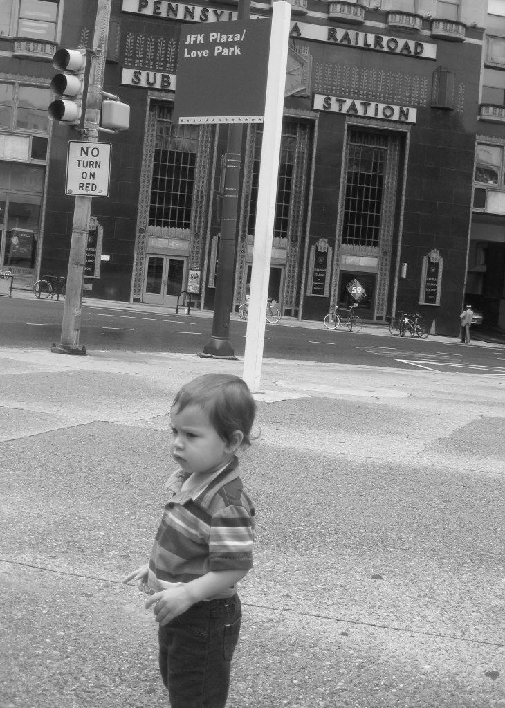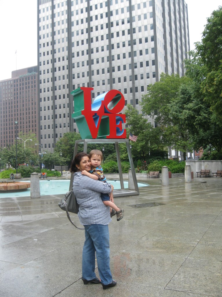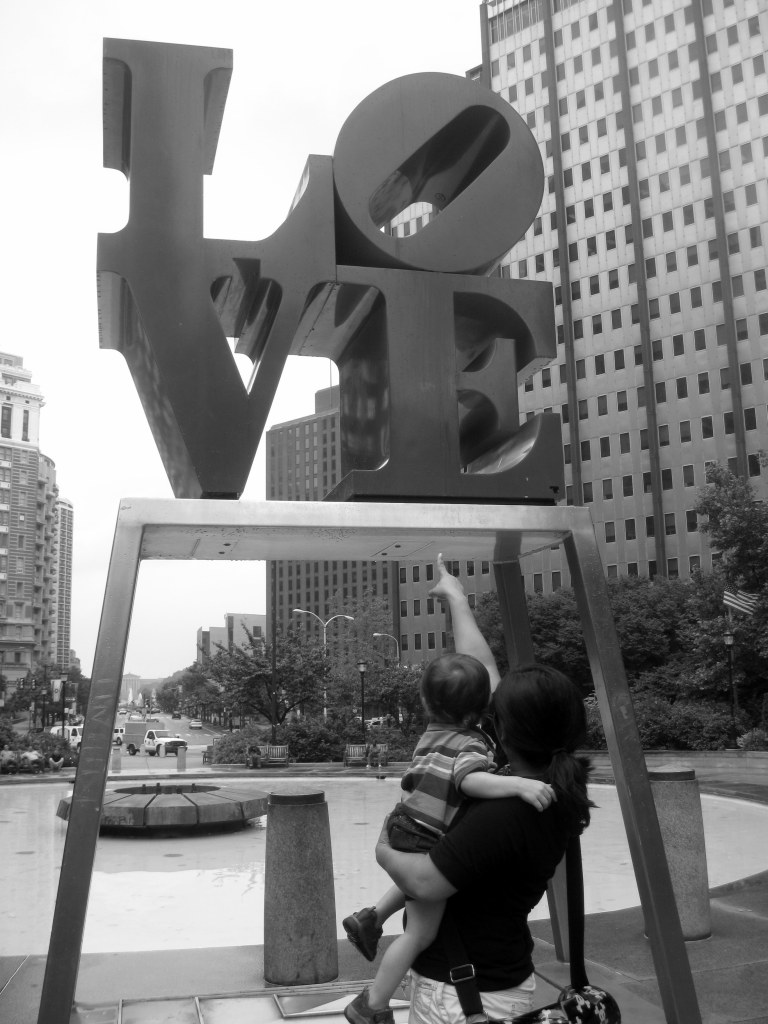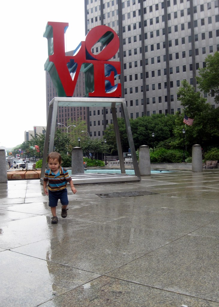 City Hall visible slightly in the background. We were in Love Park, right after a summer shower. The city looked absolutely gorgeous with droplets of water everywhere