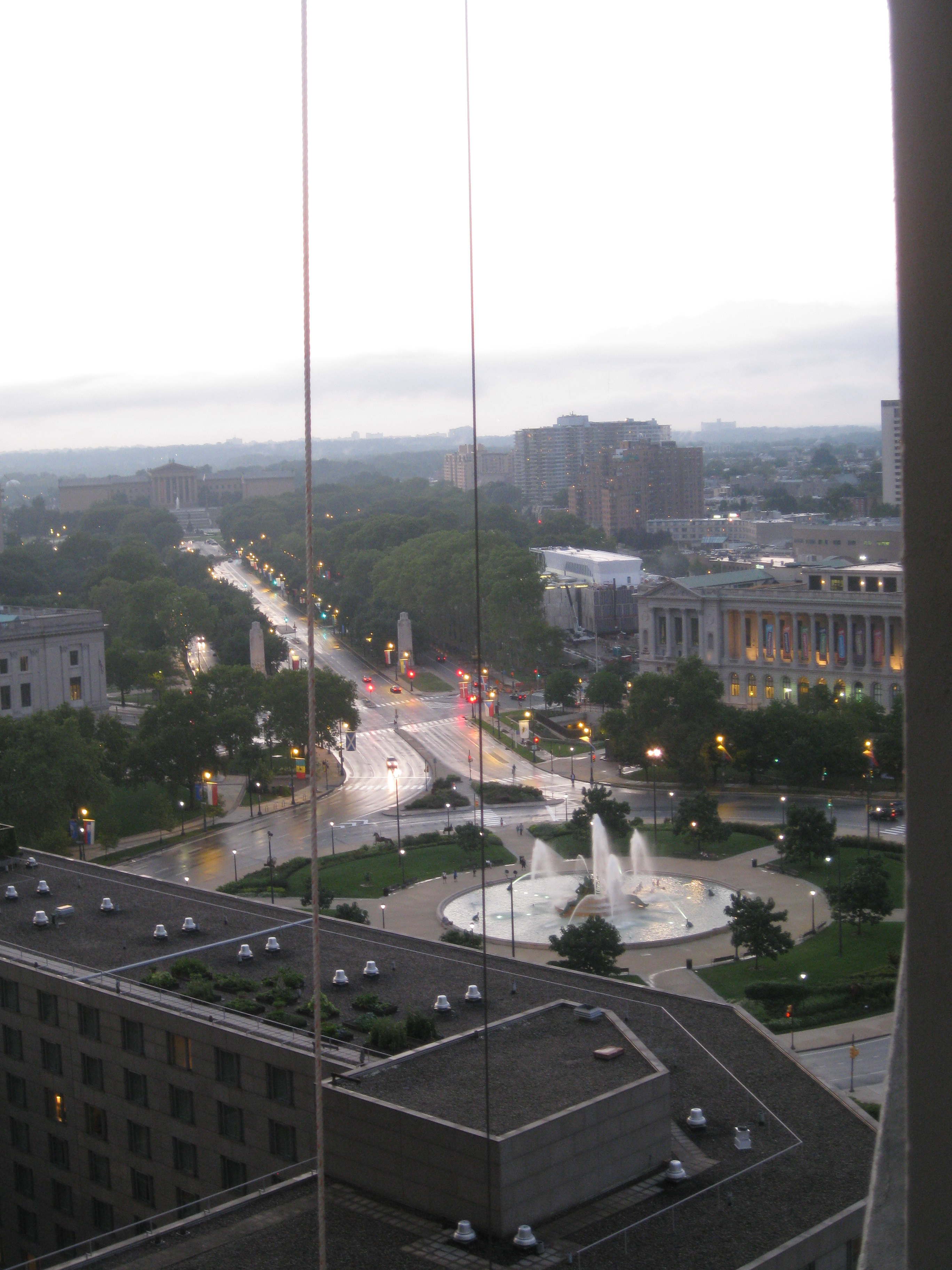 View from our hotel room on the 23rd floor. We stayed at the City Center Embassy Suites which really worked out well for us. They were doing some construction and the scaffolding ropes are in the way. The fountain is Swann Memorial fountain depicting the three major waterways of Philadelphia. In the end distance is the very Neo classical looking Philadelphia Museum of Art and also in view is the Philadelphia Free Library.