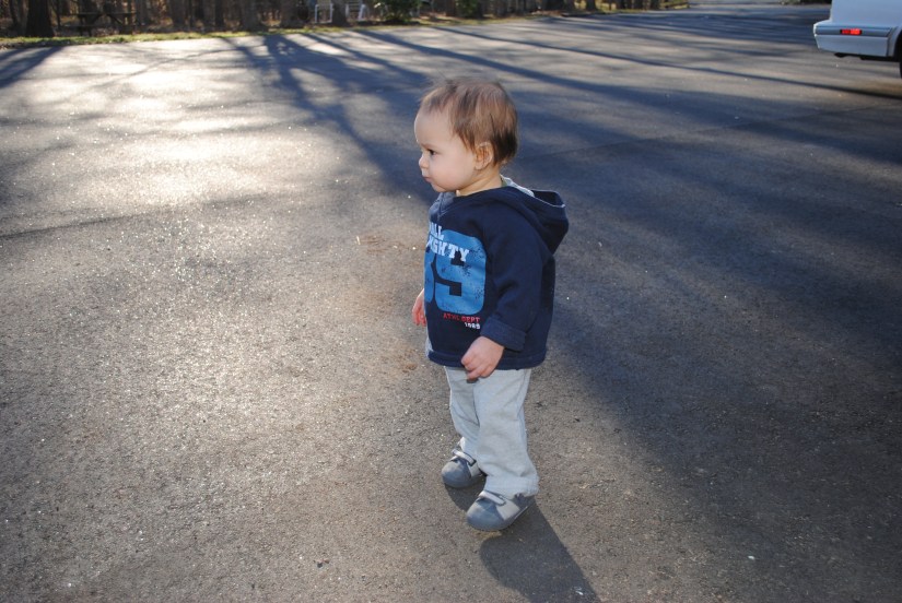 Once he actually has his shoes on and pointed at them, giggled and been left alone with them, the hate part kicks in. He is adamant about taking them off. I’m forever putting them back on when I get him out of the car seat. But things came to a head last friday. I was meeting an old friend and we had to swing by Walgreens to pick up a prescription and run a few errands. Somewhere between Walgreens and the errands Bun had managed to take off his shoes and lose them. Yes lose them. They weren’t in the car or in any of my bags. I could not take my kid to a play area without shoes,so we had to add Target to our list of stops and pick up a pair. And the cycle continued, he was thrilled while we looked at shoes, tried them on, paid for them, left the store. I put them on him in the car and of course when we pulled up to Panera and I went to get him out of the car seat, the shoes were off.  He smiled at me and said “joooewz”