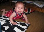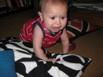 Gymboree lied to me. Not Gymboree maybe but a Gymboree book. It was a book of baby games that I brought from the library. It lists age appropriate games for babies and it highly highly highly recommends a pillow mountain for babies who are just starting to scoot or do the little butt wiggle to crawl. The baby in the gymboree was just laughing and laughing trying to climb his pillow mountain while his mom looked on fondly! This is what my baby did